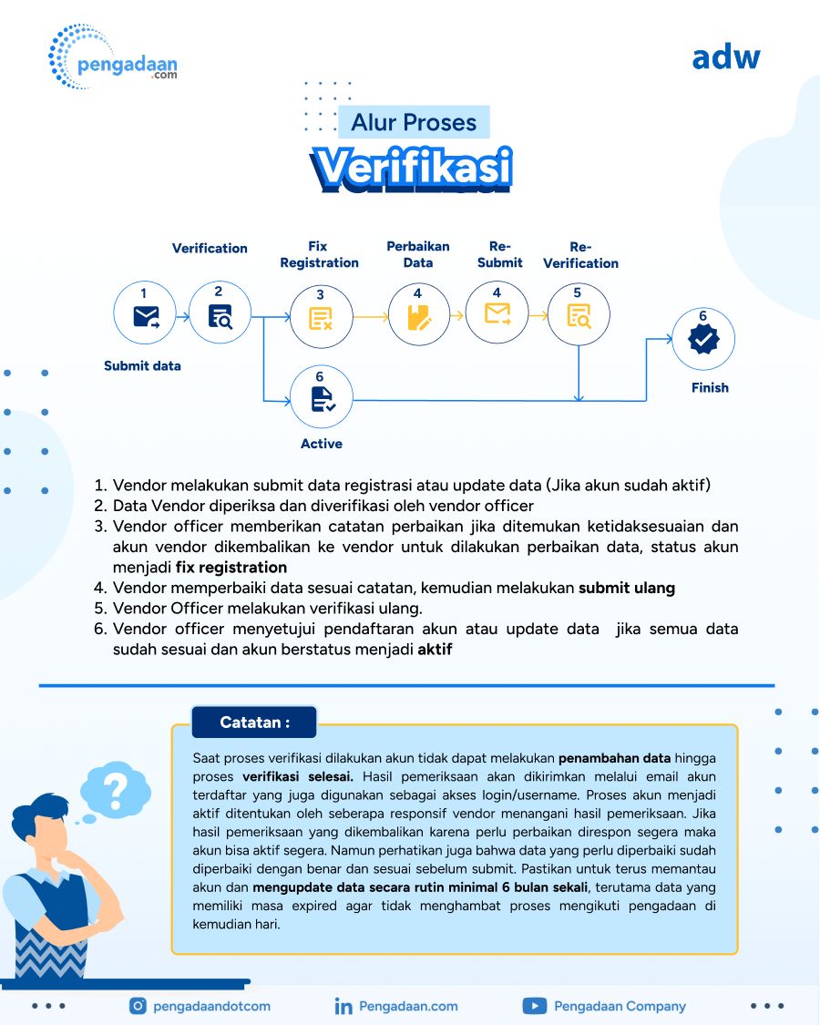 1 Pertanyaan Untuk memudahkan Registrasi di Pengadaan.com Solusi Berikut Alur Proses tahapan Regsitrasi Umum (Vendor Manajemen) Kami lampirkan pula User Manual berikut ini 1. User Manual | Non-Perorangan ...